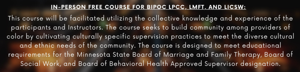 This course will be facilitated utilizing the collective knowledge and experience of the participants and Instructors. It will be taught from a relational and systemic view point while embracing ethical, culturally responsive, and clinically responsible supervision standards. The course seeks to build community among providers of color by cultivating culturally specific supervision practices to meet the diverse cultural and ethnic needs of the community. The course is designed to meet educational requirements for the Minnesota State Board of Marriage and Family Therapy, Board of Social Work, and Board of Behavioral Health Approved Supervisor designation.