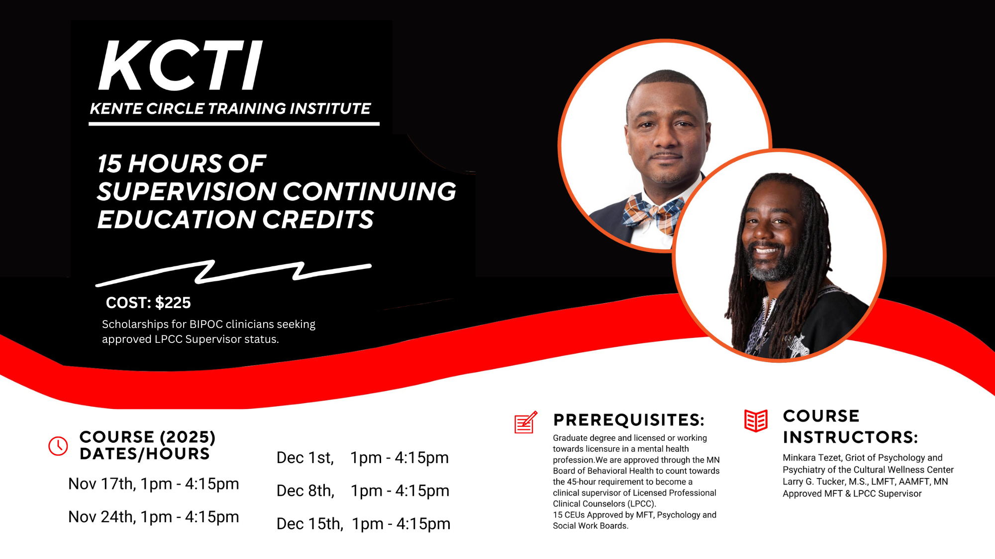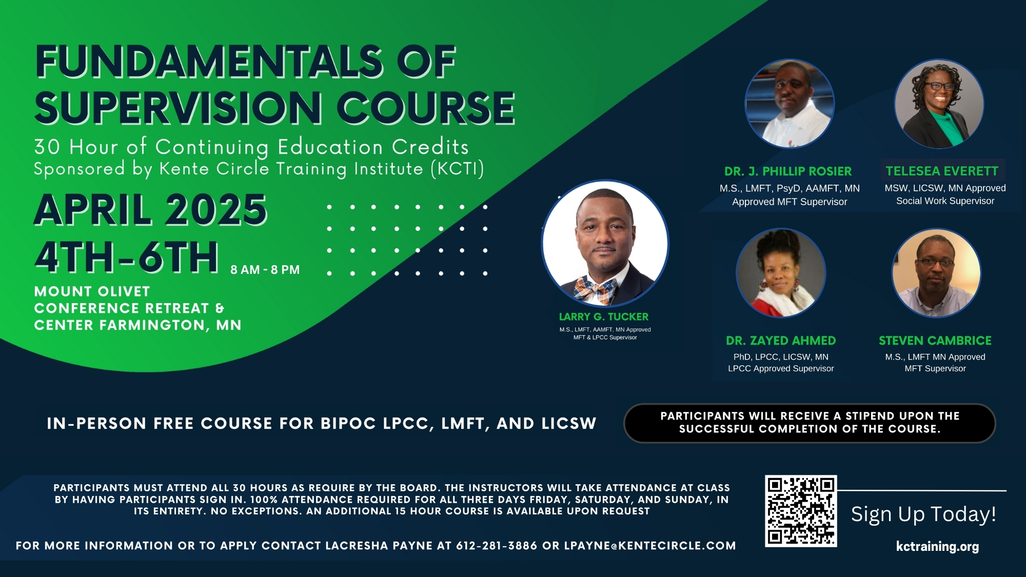 Fundamentals of Supervision Course 30 Hours of Continuing Education Credits Sponsored by Kente Circle Training Institute (KCTI)   Application Deadline: March 17th 2025 Event Dates: April 4th - 6th: 8AM - 8PM Course Requirement:  Your commitment is important to the success of this course. The course will meet for 30 hours. A Part 2 course for […]